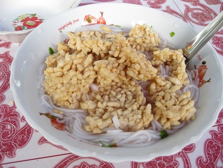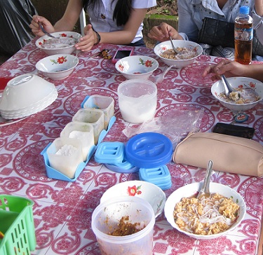 すっぱちょい辛いスープに、カオプンと言われる太いそうめんをふやかしたような麺や寒天みたいなものを入れて食べます。