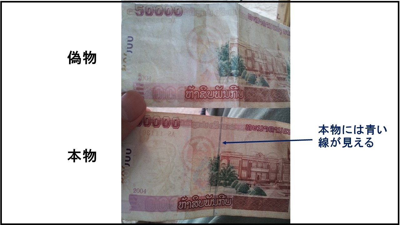 キープ(ラオスの通貨)のお札の偽札があったということで見せてもらいました。