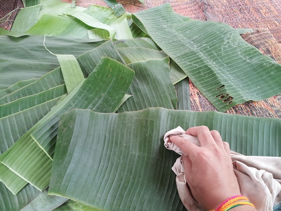 私が手伝えるのは、バナナの葉を拭いてきれいにすることくらい。