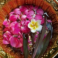 花や香水を入れてつくられた参拝用の聖水を、花や葉を使って仏像にかけていきます。