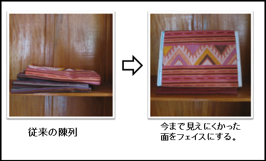 現状、この陳列方法では布が売られているのは分かりますが、“その違いが何なのか”、“どういった商品なのか”は一目ではよく分かりません。