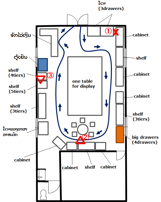 現状、下のところ(図内②)では接客用のテーブルとイスが、客動線を阻害してしまっている可能性があり、注意が必要です。