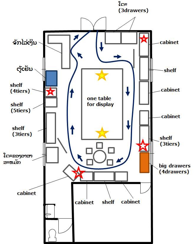 今のPMC店舗のレイアウトにおいて、単純に考えれば、赤い☆印のところにマグネットを配置するのが効果的だと思われます。(重要度に合わせて、星の大きさを変えています。)
