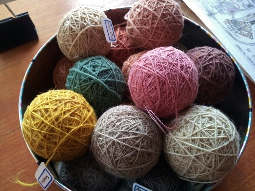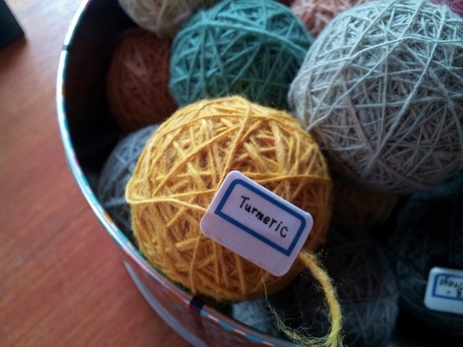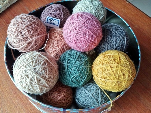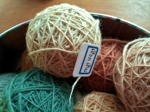 以前染めた草木染の綿糸を丸めて、小さなボールを作っています。